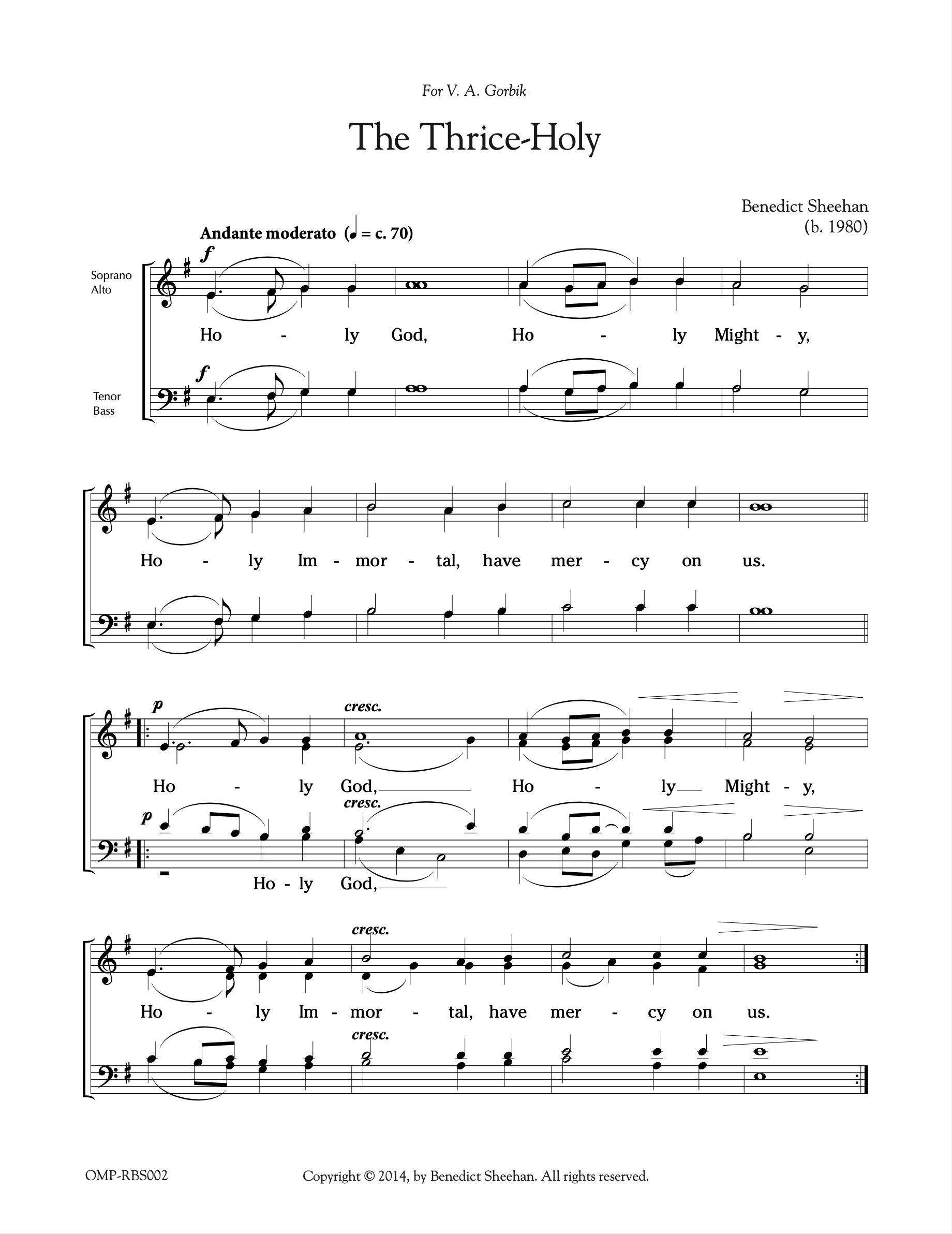 SATB a cappella. Processional from the Eastern Orthodox Divine Liturgy. (c. 3 min) Copyright © 2014 Rowan Benedict Sheehan.